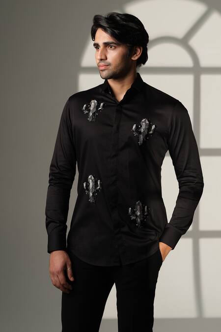A black shirt crafted from stretchable cotton, featuring a classic collar and full sleeves.