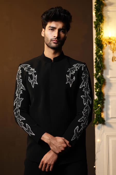 Black bandhgala featuring full sleeves and cutdana placement embroidery in a floral pattern. Paired with matching pants for a complete look.