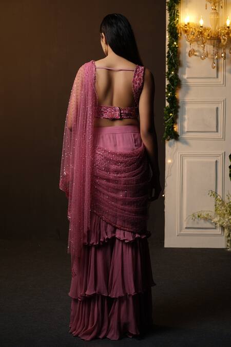 Pink layered pre-draped saree featuring sequin and cutdana embroidery on the pallu. Paired with a floral embroidered blouse.