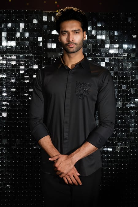 Black shirt featuring a placed hand embroidered tonal cutdana tiger motif