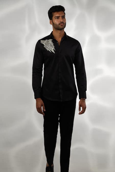 Black cotton shirt featuring gunmetal cutdana hand embroidered wolf design