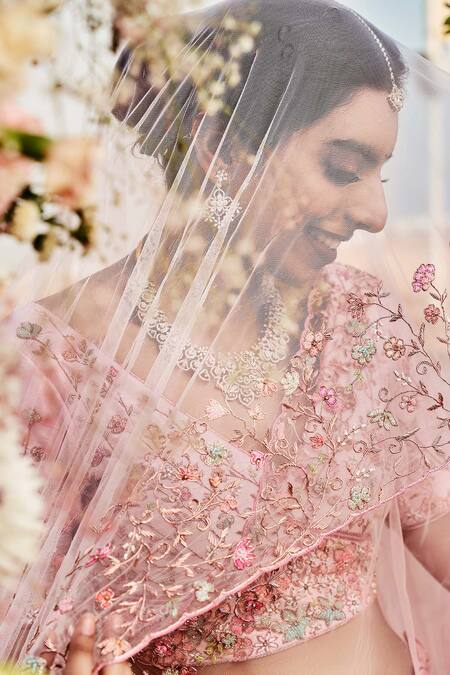 Pink lehenga featuring hand embroidered floral and swan patterns with pearl, zari, aari, resham & anchored French knots work. Paired with a V neck padded blouse, embroidered nylon net dupatta, veil, and a belt.