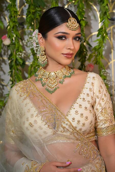 Ivory Blouse And Lehenga Pure Raw Silk Hand Embroidery Floral Deep V Bridal Set