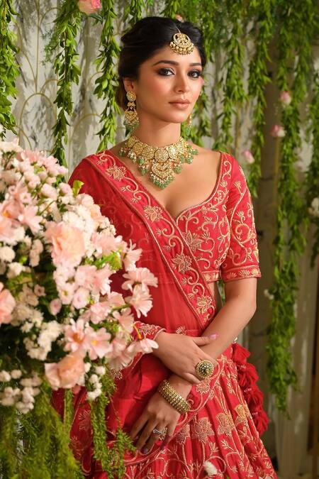 Red lehenga featuring hand embroidery with floral zardozi and zari work. Paired with a padded blouse and a nylon net dupatta with zari embroidered borders.