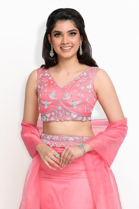 Peach embroidered mermaid lehenga featuring layered waterfall ruffle panels. Paired with a V neck padded blouse adorned with floral and bird pattern French knots, resham, cut dana, and sequins work, along with a matching dupatta.