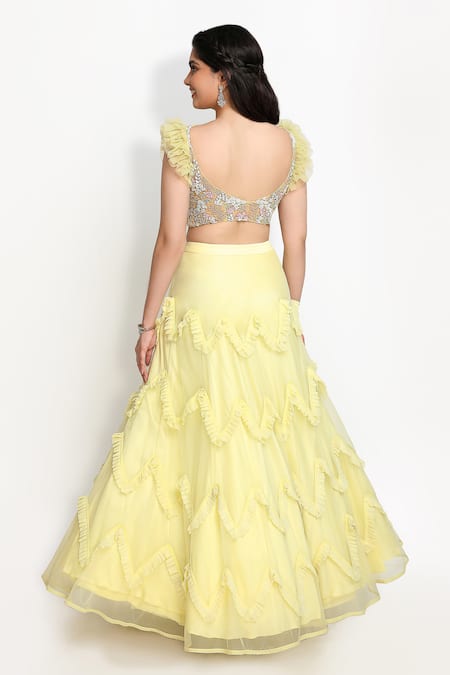 Yellow lehenga featuring ruffled panels and a sweetheart neck blouse with floral embroidery. Paired with a dupatta with frill border.