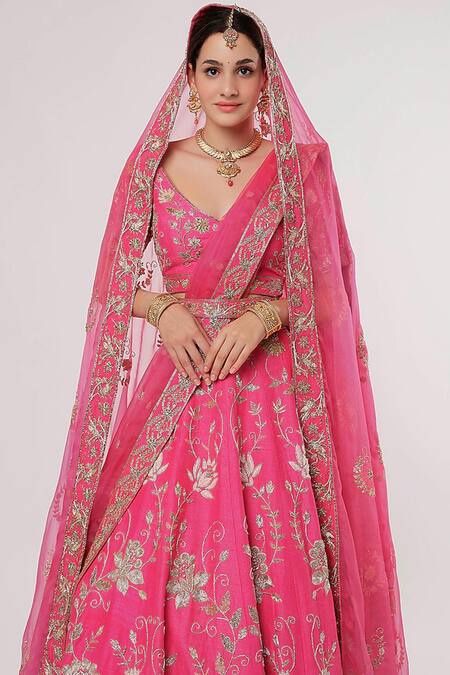 Pink Pure Raw Silk Hand Embroidered Thread V Neck And Zari Bridal Lehenga Set