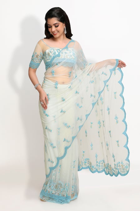 Blue saree in nylon net featuring an all-over floral pattern and scalloped cut work border. Paired with a square neck padded blouse adorned with zardozi, stones, and anchored French knots embroidery.
