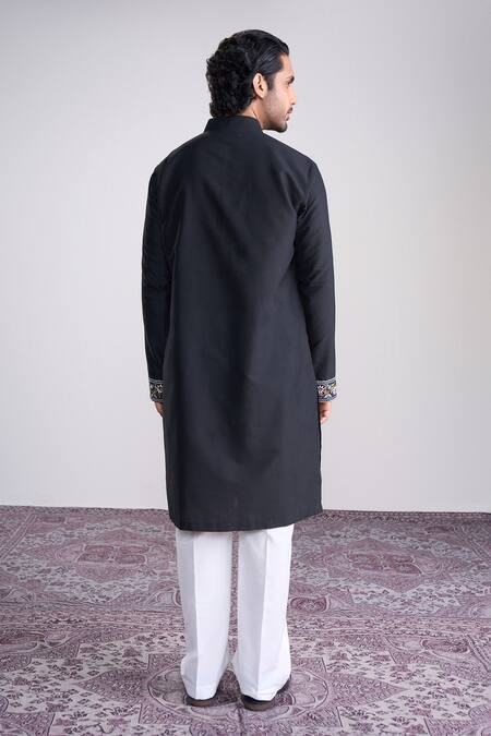 Black kurta in cotton silk featuring intricate embroidery on the neckline and sleeves. Paired with matching white pants for a complete look.