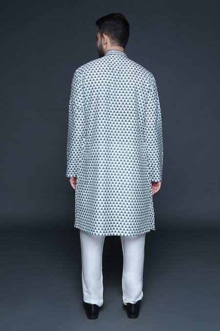 Grey kurta featuring all-over hand block print with sequin, bead, and cut dana hand embroidery. Paired with matching pants for a complete look.