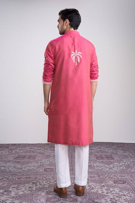 Pink kurta made from cotton silk featuring palm tree motifs and a front placket. Paired with matching plain white pant.