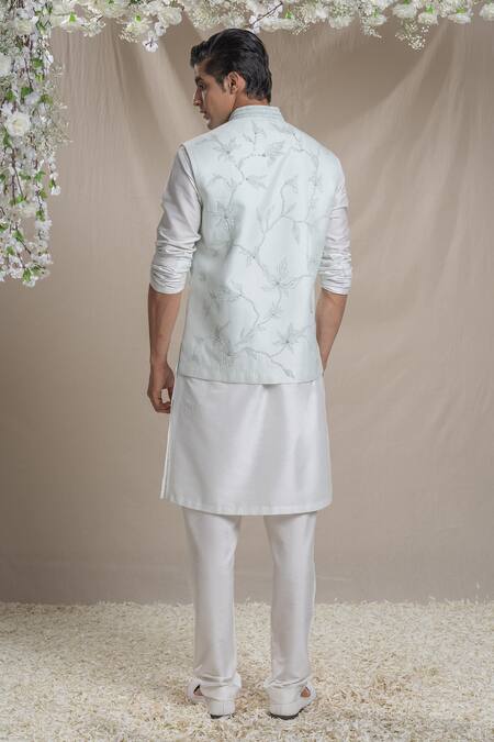 Sky blue cotton silk bundi featuring embroidered delicate snow flower motifs highlighted with cutdana. Paired with a matching kurta and pant.