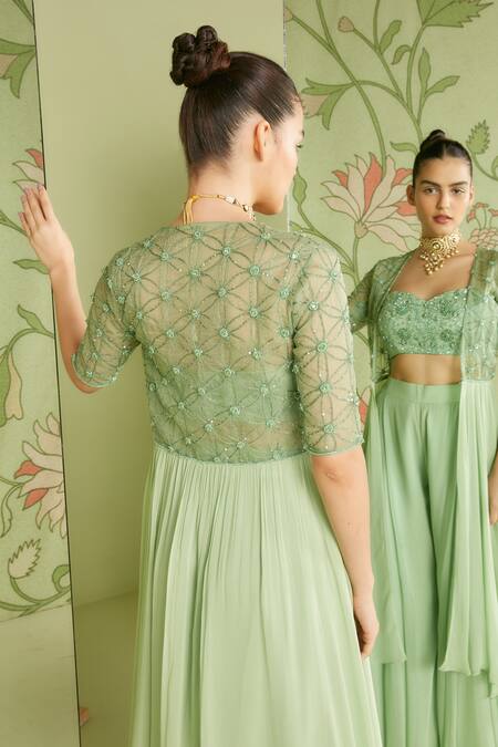 Sage green georgette floral embroidered jacket. Paired with embroidered crop top and flared pant.