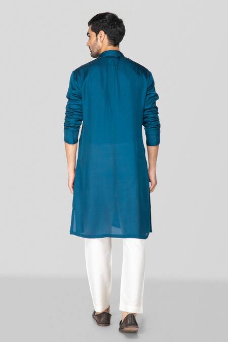 Blue kurta featuring a thread embroidered floral placket with a mandarin collar. Paired with matching pants in a straight silhouette.