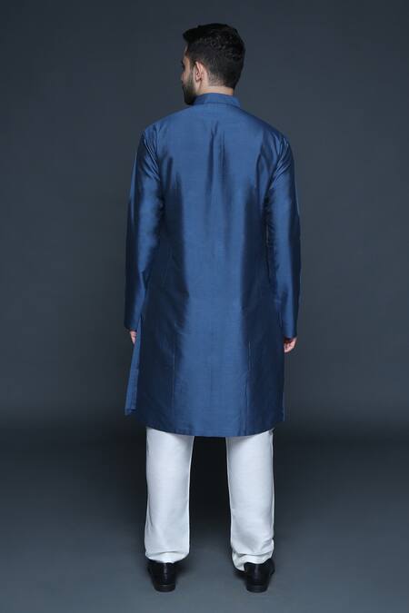 Royal blue kurta featuring full sleeves and a stand collar, adorned with intricate tonal hand embroidered floral motifs. Paired with white straight fit pants.