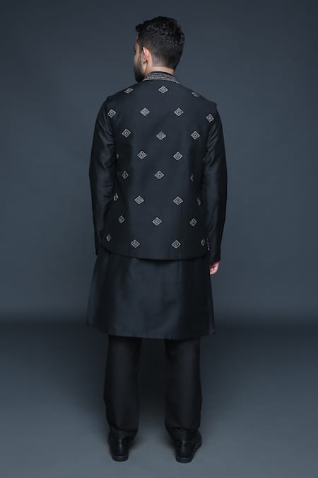 Black cotton silk bundi featuring a mandarin collar with geometric sequin, cut dana embellishments, and intricate thread work. Paired with a full-sleeved kurta and pants, the set includes an embroidered placket and side slits on the kurta.