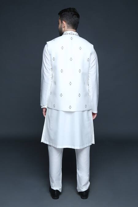 Ivory cotton silk bundi featuring mandarin collar and hand embroidered geometric patterns with sequin, bead & thread work. Paired with a full sleeve kurta and pants.