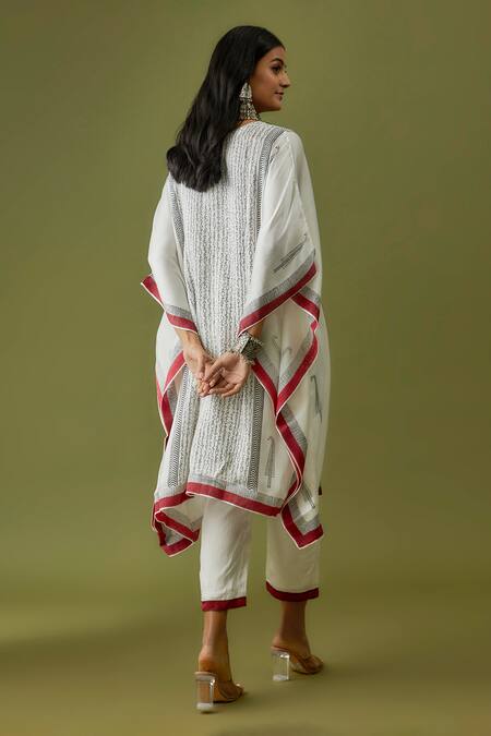 Ivory kaftan featuring abstract hand block print with embroidered neckline. Paired with matching pant featuring detailed hem.