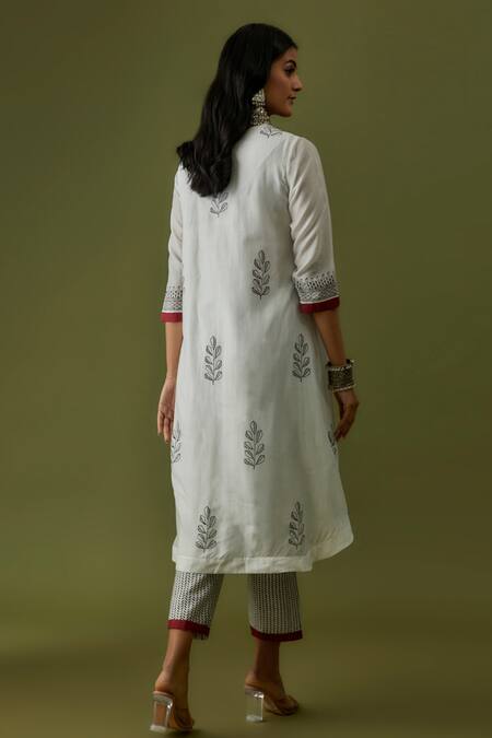 Ivory Cotton Silk Hand Block Printed V Neck Kurta And Pant Set