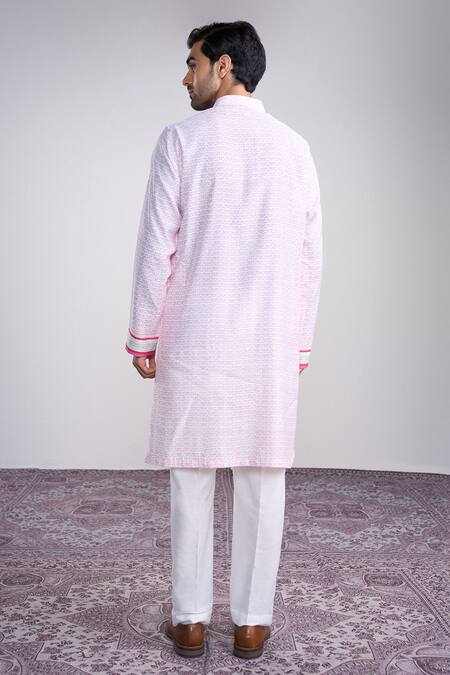 Ivory kurta featuring a printed design with a stand collar and contrasting placket. Paired with matching plain pants.