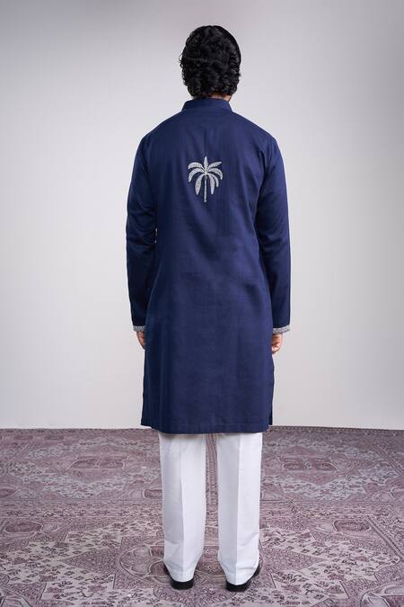 Navy blue kurta featuring palm tree embroidery and a mandarin collar. Paired with matching white pant for a complete look.