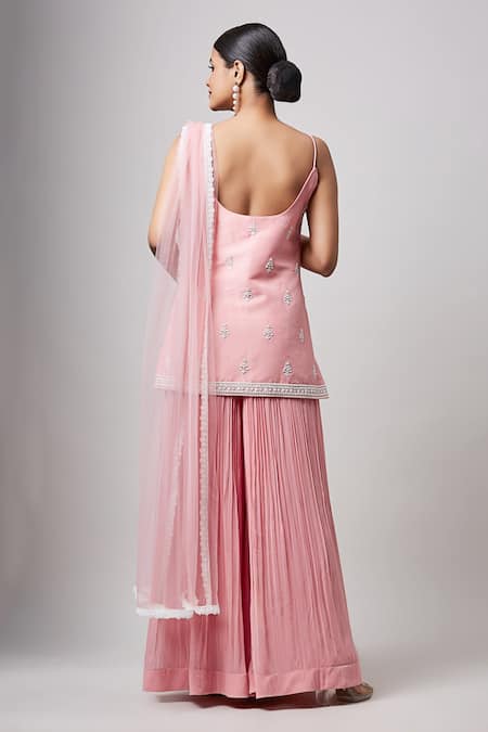 Pink Net, Georgette, Silk Pearls Scoop Neck Embroidered Kurta Sharara Set
