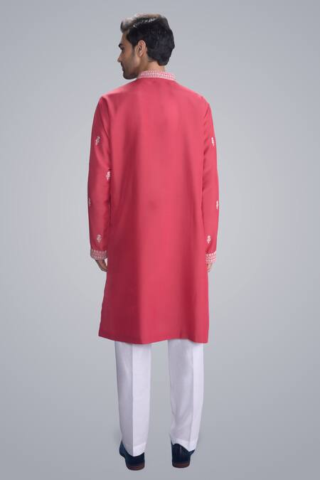Red kurta in cotton silk featuring intricate embroidery and a mandarin collar. Paired with matching white pants for a complete look.
