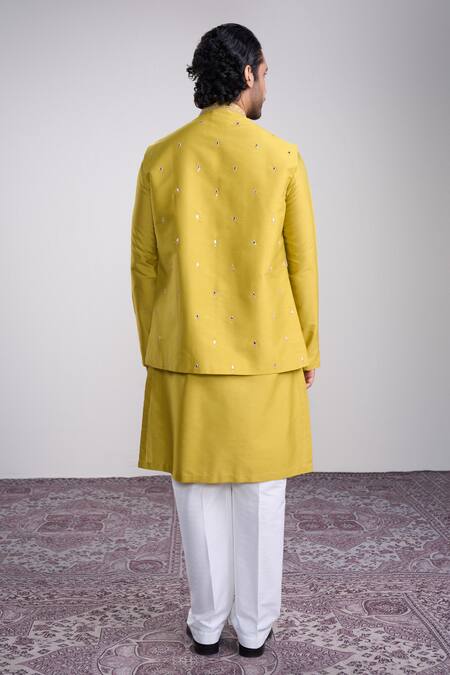 Yellow kurta featuring intricate embroidery and a front placket. Paired with a matching bundi and white pant.
