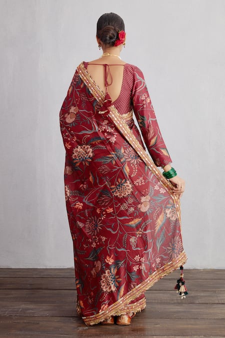 Garnet red saree with all-over floral motif print, embroidered border & tassel pallu.