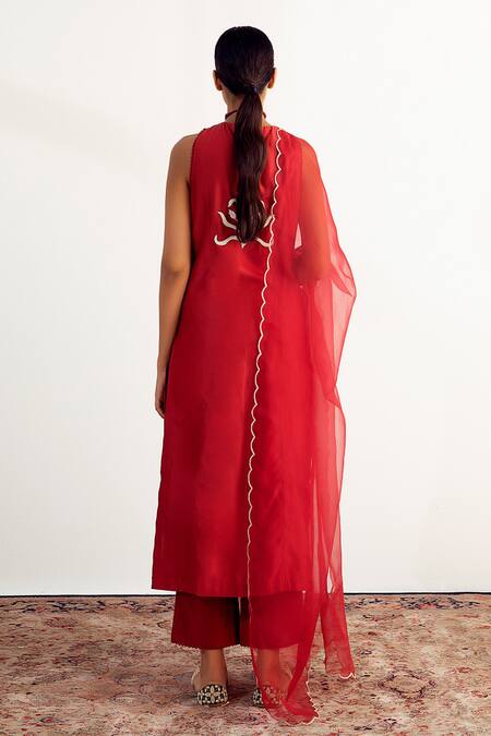 Marron halter neck straight kurta with contrast white dori embroidery highlighted with zari, badla & pearl. Paired with pant & silk organza scalloped border dupatta.