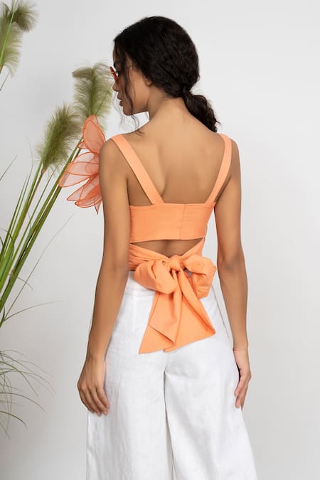 Coral top featuring a sweetheart neckline with 3D flower applique and under bust cut-out detailing. Paired with handcrafted beads embellished wide-leg pant made from 100% linen.