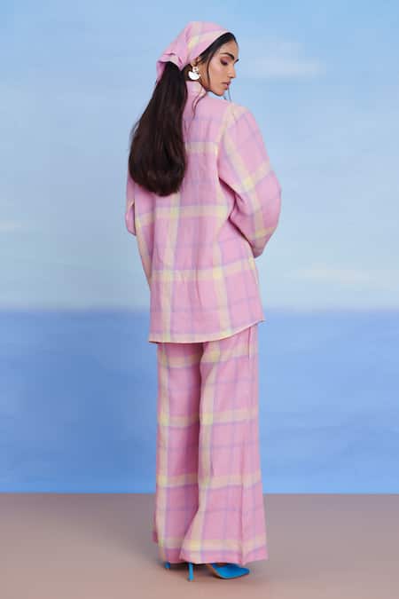 A Cassata pink double-breasted blazer shirt is cut from 100% pure linen, featuring bold stripes and delicate floral embroidery. It has a relaxed fit, notched lapel, and functional side pockets.