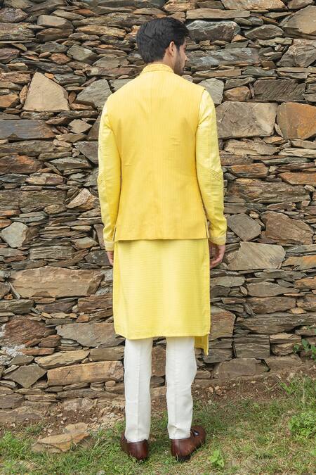 Yellow Bhagalpuri , Herringbone And Cotton Thread Bundi & Kurta Set