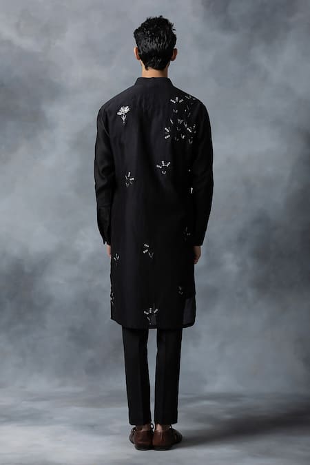 Black kurta featuring full sleeves and a mandarin collar with sequin floral embroidery. Paired with matching black pants.