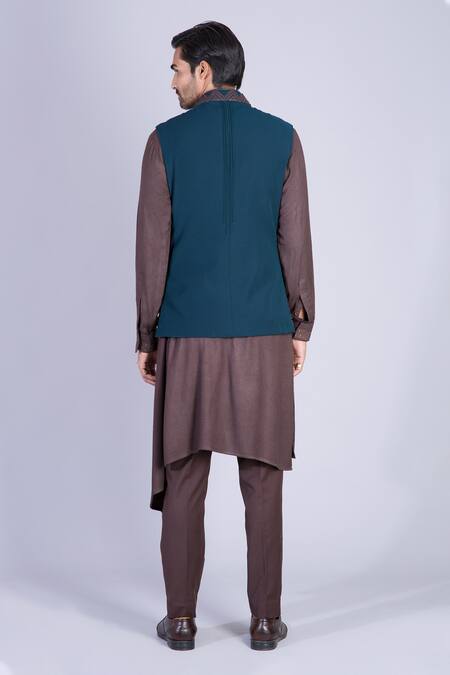 Teal blue bundi with applique embroidered detail. Paired with draped kurta & pant.