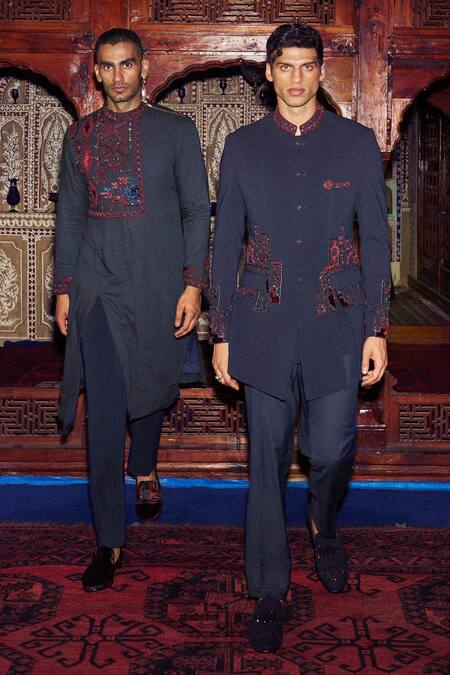 Mid night blue herringbone side yoke embellished kurta. Comes with navy slim fit trouser.