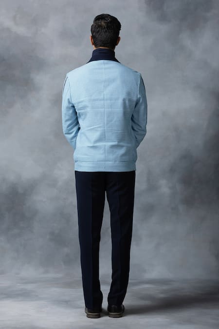 Blue bomber jacket featuring fine checkered patterns and patch pockets