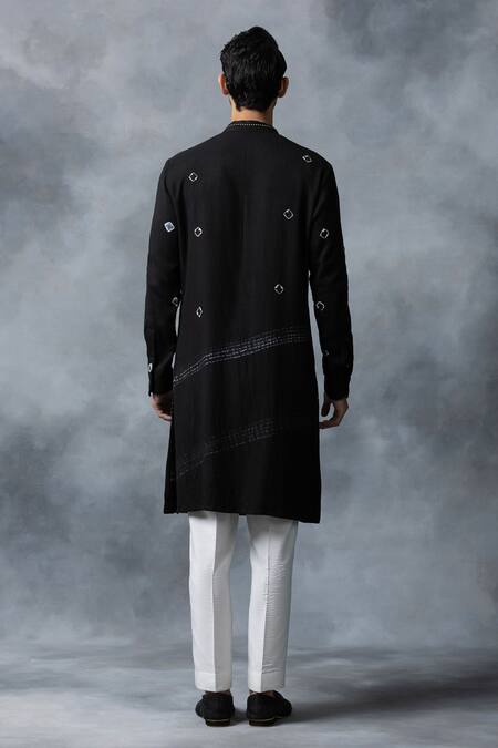 Black kurta featuring tie dye pattern with metallic stud embroidery on the placket and neckline. Paired with a matching pant and designed in a relaxed fit.