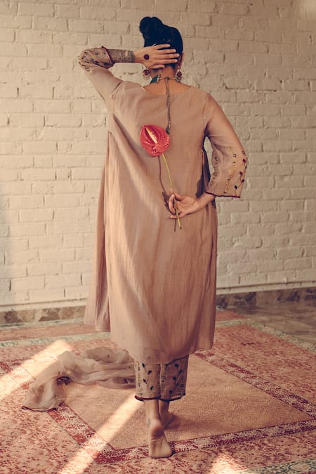 Grey , Silk Sequins, Beads Floral Bel Hem Kurta And Pant Set