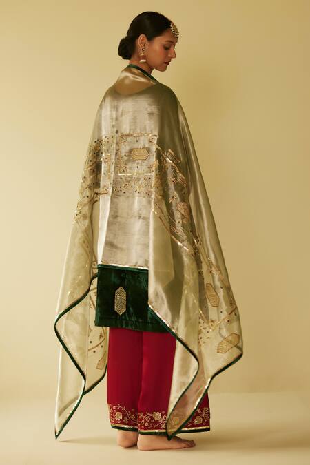 Green tissue silk dupatta featuring floral hand embroidery