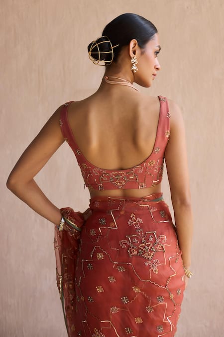 Orange Patiala saree with intricate hand embroidery and a matching blouse. Paired with a fitted blouse featuring similar embroidery.