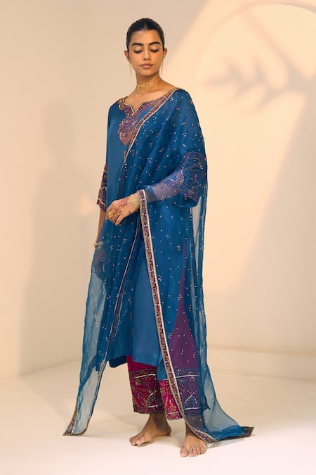 Blue dupatta featuring intricate hand embroidery with sequin, thread, and beads