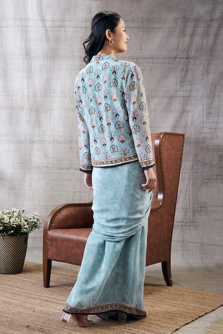 Shop_Soup By Sougat Paul_Blue Crepe Embroidery Mandarin Collar Sarouk Print Draped Skirt And Top Set _at_Aza_Fashions