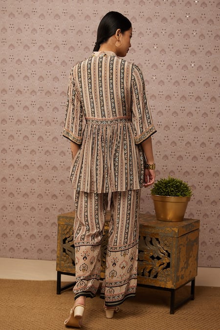 Beige pleated kurta with all-over sarouk print, sequin embroidery on the borders and slit in front. Comes with co-ordinating palazzo.