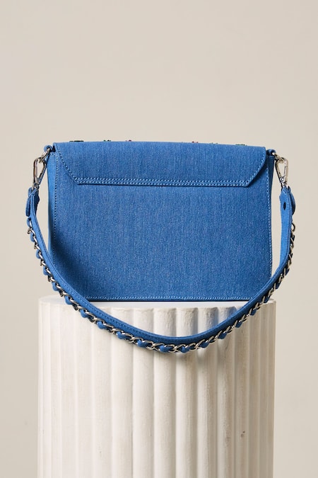 Blue Beads, Pearls Blossom Embroidered Denim Bag