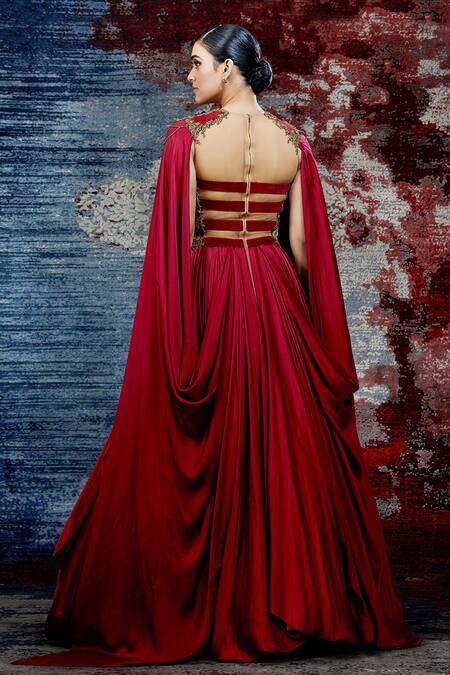Buy_Shantnu Nikhil_Maroon Satin Draped Gown_Online_at_Aza_Fashions