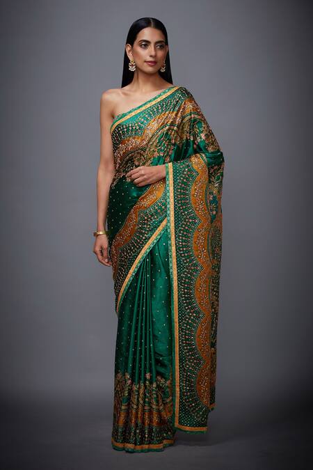 Emerald & mustard printed saree with zardosi work floral motifs. Comes with unstitched blouse fabric.