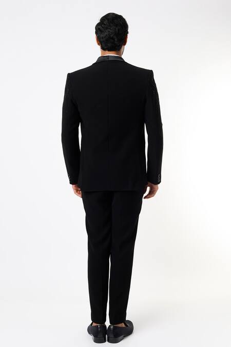 Black tuxedo with hand embroidery & satin lapel. Paired with waistcoat, pintucked ivory shirt & black pant.