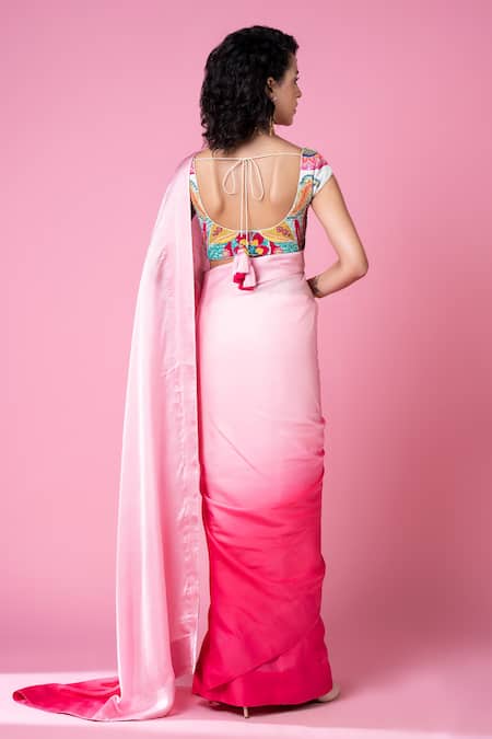 Back tassel tie-up detail, Butterfly hand embroidery on blouse, Ombre color gradient effect