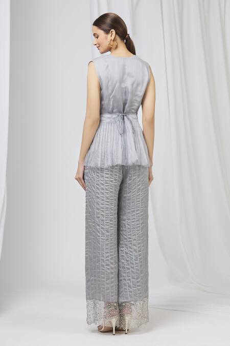 Blue peplum top with pleated detail. Comes with flared pant and belt.